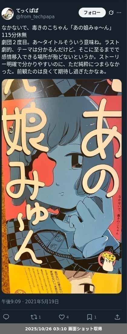 【ネタバレ分離】昨日観た芝居、 なかないで、毒きのこちゃん「あの娘みゅ~ん」の観劇レポートです。