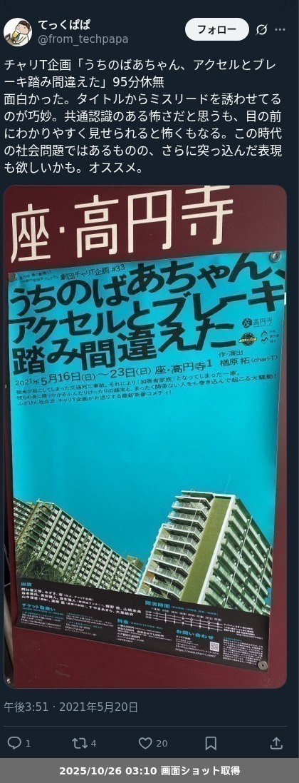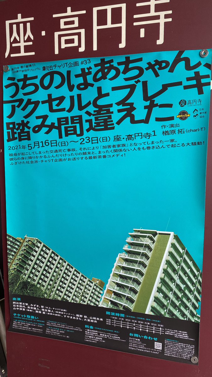 【ネタバレ分離】昨日観た芝居、 劇団チャリT企画「うちのばあちゃん、アクセルとブレーキ踏み間違えた」の観劇レポートです。