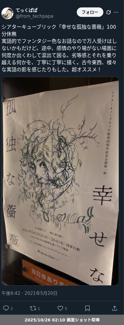 【ネタバレ分離】昨日観た芝居、 シアターキューブリック「幸せな孤独な薔薇」の観劇レポートです。