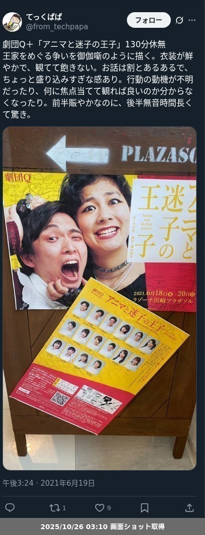 【ネタバレ分離】昨日観た芝居、 劇団Q+「アニマと迷子の王子」の観劇レポートです。