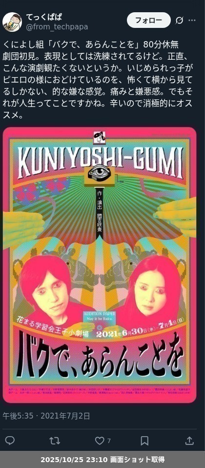 【ネタバレ分離】昨日観た芝居、 くによし組「バクで、あらんことを」の観劇レポートです。