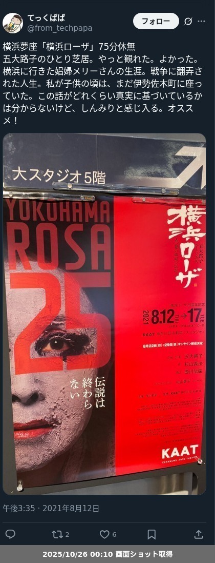 【ネタバレ分離】昨日観た芝居、 横浜夢座「横浜ローザ 赤い靴の娼婦の伝説」の観劇レポートです。