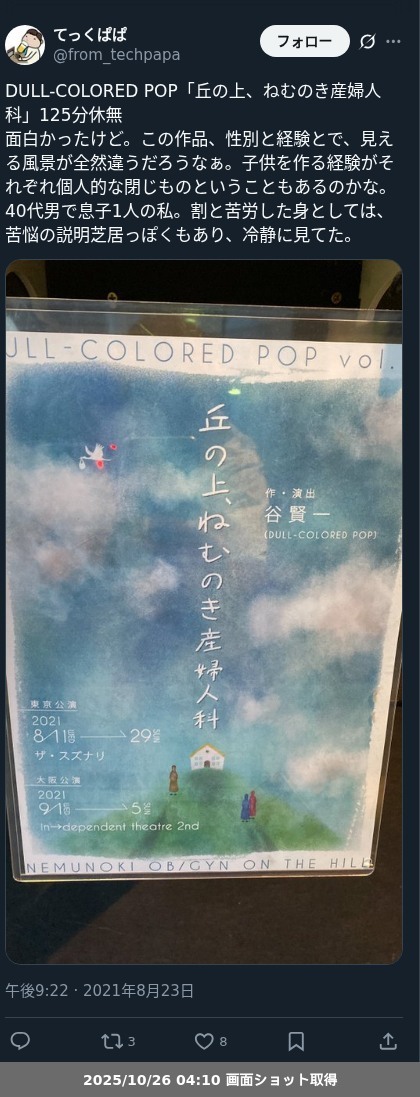 【ネタバレ分離】昨日観た芝居、 DULL-COLORED POP「丘の上、ねむのき産婦人科」の観劇レポートです。