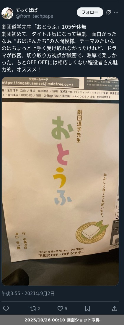 【ネタバレ分離】昨日観た芝居、 劇団道学先生「おとうふ」の観劇レポートです。
