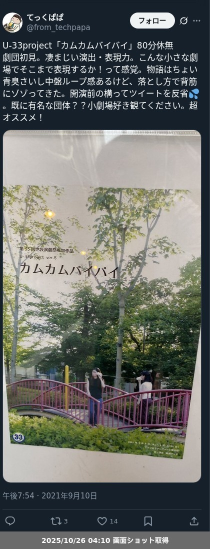 【ネタバレ分離】昨日観た芝居、 U-33project「カムカムバイバイ」の観劇レポートです。