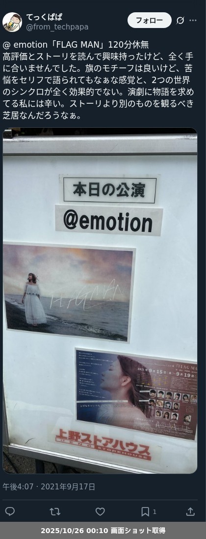 【ネタバレ分離】昨日観た芝居、 @emotion「FLAG MAN」の観劇レポートです。