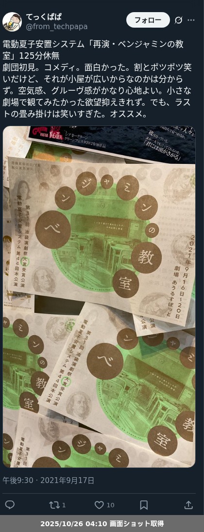 【ネタバレ分離】昨日観た芝居、 電動夏子安置システム「ベンジャミンの教室」の観劇レポートです。