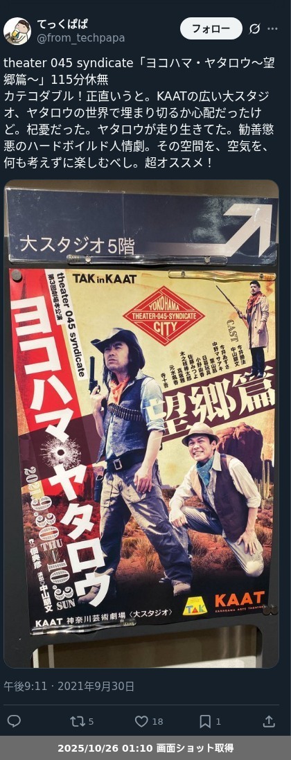 【ネタバレ分離】昨日観た芝居、 theater 045 syndicate「ヨコハマ・ヤタロウ」の観劇レポートです。