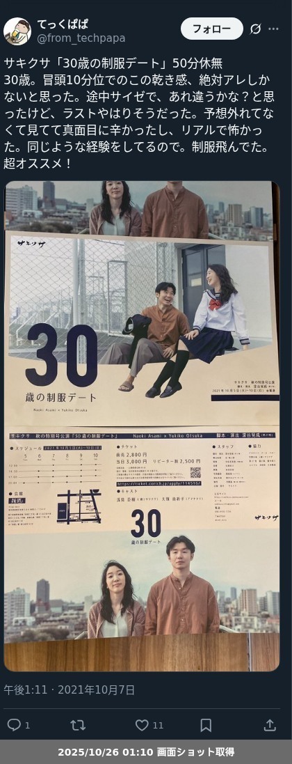 【ネタバレ分離】昨日観た芝居、 サキクサ「30歳の制服デート」の観劇レポートです。