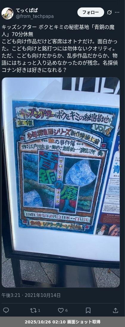 【ネタバレ分離】昨日観た芝居、 キッズシアター~ボクとキミの秘密基地~「青銅の魔人」の観劇レポートです。