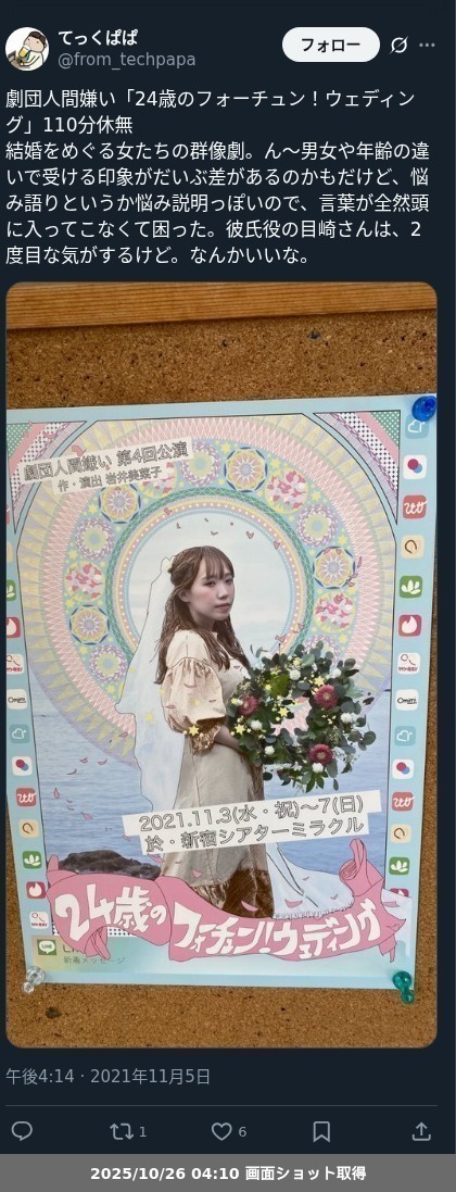 【ネタバレ分離】昨日観た芝居、 人間嫌い「24歳のフォーチュン!ウェディング」の観劇レポートです。