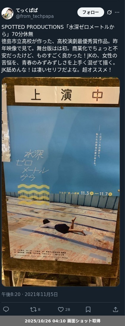 【ネタバレ分離】昨日観た芝居、 SPOTTED PRODUCTIONS「水深ゼロメートルから」の観劇レポートです。