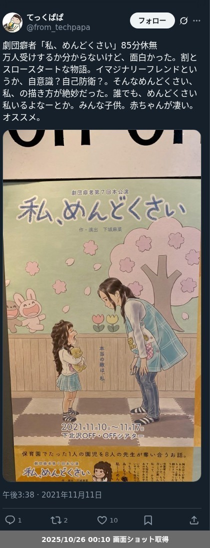【ネタバレ分離】昨日観た芝居、 劇団癖者「私、めんどくさい」の観劇レポートです。