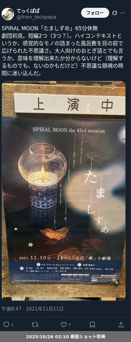 【ネタバレ分離】昨日観た芝居、 SPIRAL MOON「たましずめ」の観劇レポートです。