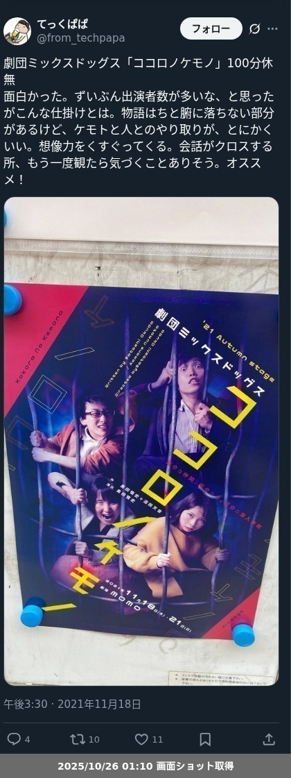 【ネタバレ分離】昨日観た芝居、 劇団ミックスドッグス「ココロノケモノ」の観劇レポートです。