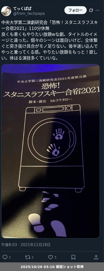 以前一度、観劇したことがある学生劇団。郵送DMを送って頂いている。開封して、芝居のタイトルに思わず吹き出してしまったので、観劇を決めた。スタニスラフスキーとは、ロシアの演出家。現代の俳優の訓練・演技論は、彼の作ったスタニスラフスキー・システムに影響を受けているが、同時に「この演技論は退屈!」と皮肉を込めて語られることもある。何が恐怖なのか、気になっての観劇。