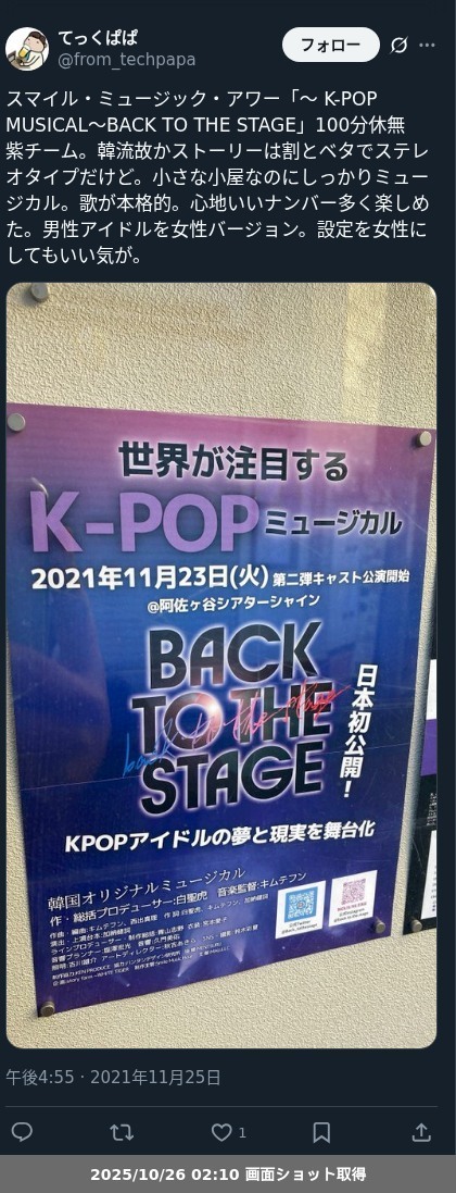 【ネタバレ分離】昨日観た芝居、スマイル・ミュージック・アワー「~ K-POP MUSICAL ~BACK TO THE STAGE シーズン2」の観劇レポートです。