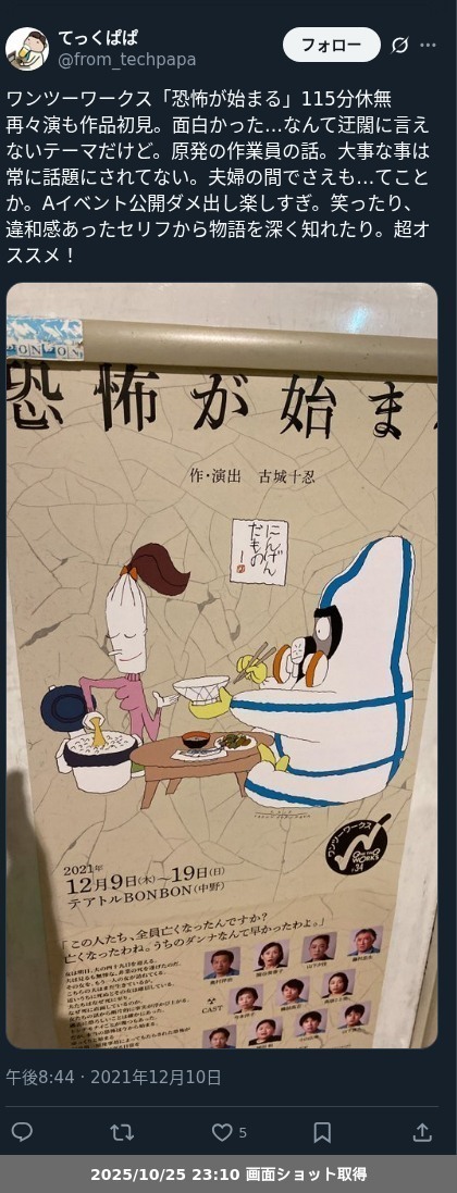 【ネタバレ分離】昨日観た芝居、 ワンツーワークス「恐怖が始まる」の観劇レポートです。