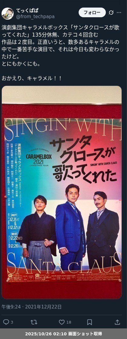 【ネタバレ分離】昨日観た芝居、 演劇集団キャラメルボックス「サンタクロースが歌ってくれた」の観劇レポートです。