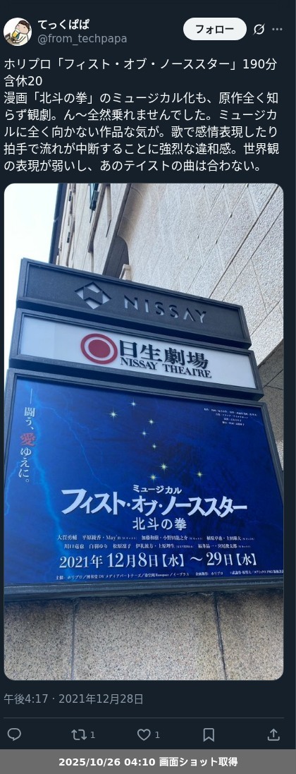 漫画「北斗の拳」のミュージカル化も、原作全く知らず観劇。ん~全然乗れませんでした。ミュージカルに全く向かない作品な気が。歌で感情表現したり拍手で流れが中断することに強烈な違和感。世界観の表現が弱いし、あのテイストの曲は合わない。