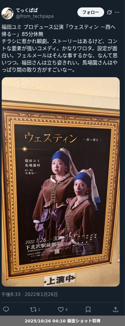 出演は、プロデュースの主催の福田ユミと、お笑いコンビ、アジアンの馬場園梓。ストーリーだけ書くと少し深刻な雰囲気もあるものの、基本的にはコメディ。2人の会話が面白く、ケラケラと笑ってしまうような作品。どちらかというと、コントの要素が強いかもしれない。フェルメールが、モデルをオーディションで選んでいた、というのもちょっと信じられないツッコミどころ満載の設定だけれど(実際、どうだったんだろう)そこも含めて、コント・コメディっていう感覚の作品だった。