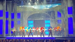 加えて、舞台版では、雨。14トンの水っていう事だけど。やっぱり実際に観ると迫力ある。最前列4列くらいは、ハッピーレイン・シートで、専用の黄色い雨がっぱもらえて、飛んでくる水しぶきを受けれる。1幕の最後に「Singin' in the rain」で終わるので、休憩時間に舞台まで駆け寄ってみた。かっぱが必要なほど、水は飛んでなかったけど、それでもやっぱり水しぶきすごい。目の前でももう一回見てみたい。