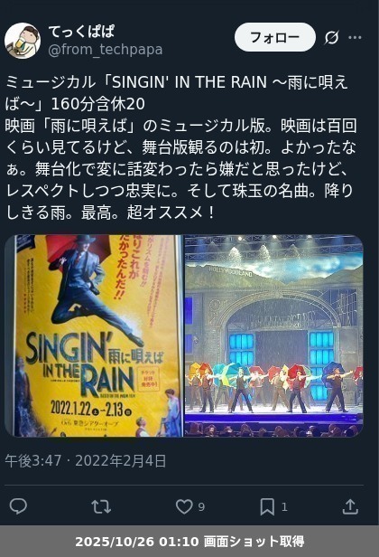 【ネタバレ分離】昨日観た芝居、 ミュージカル「SINGIN' IN THE RAIN ~雨に唄えば~」の観劇レポートです。