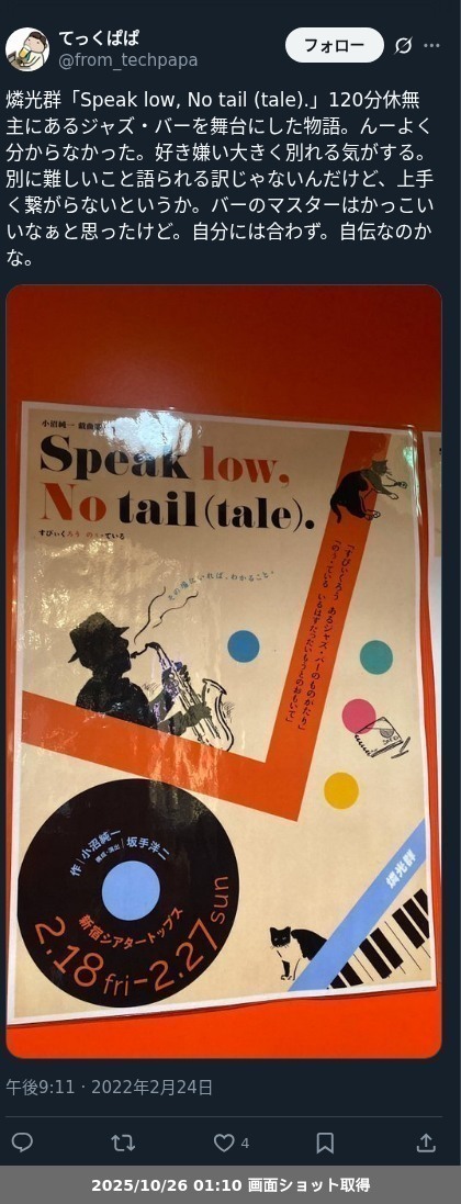 【ネタバレ分離】昨日観た芝居、 燐光群「Speak low, No tail (tale).」の観劇レポートです。