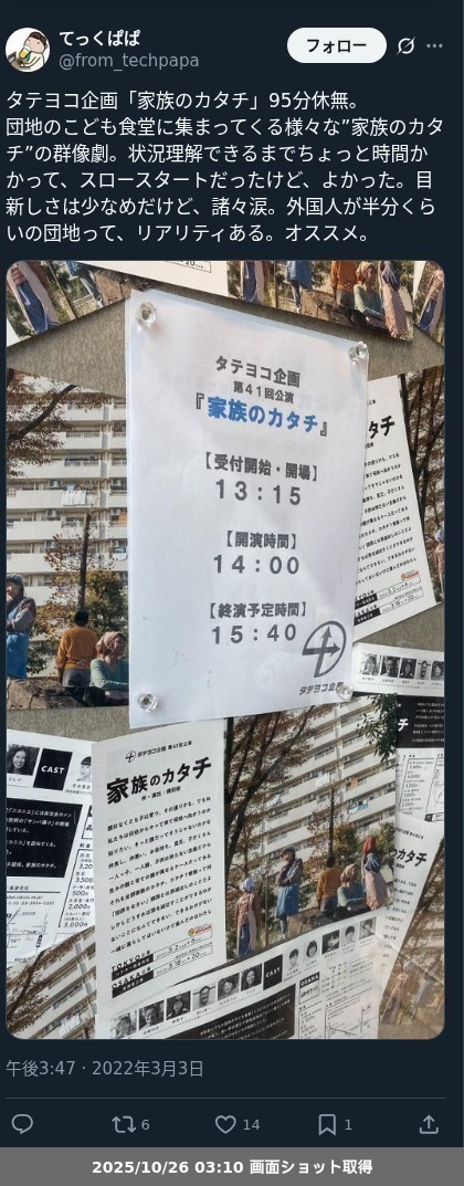【ネタバレ分離】昨日観た芝居、 タテヨコ企画「家族のカタチ」の観劇レポートです。