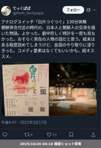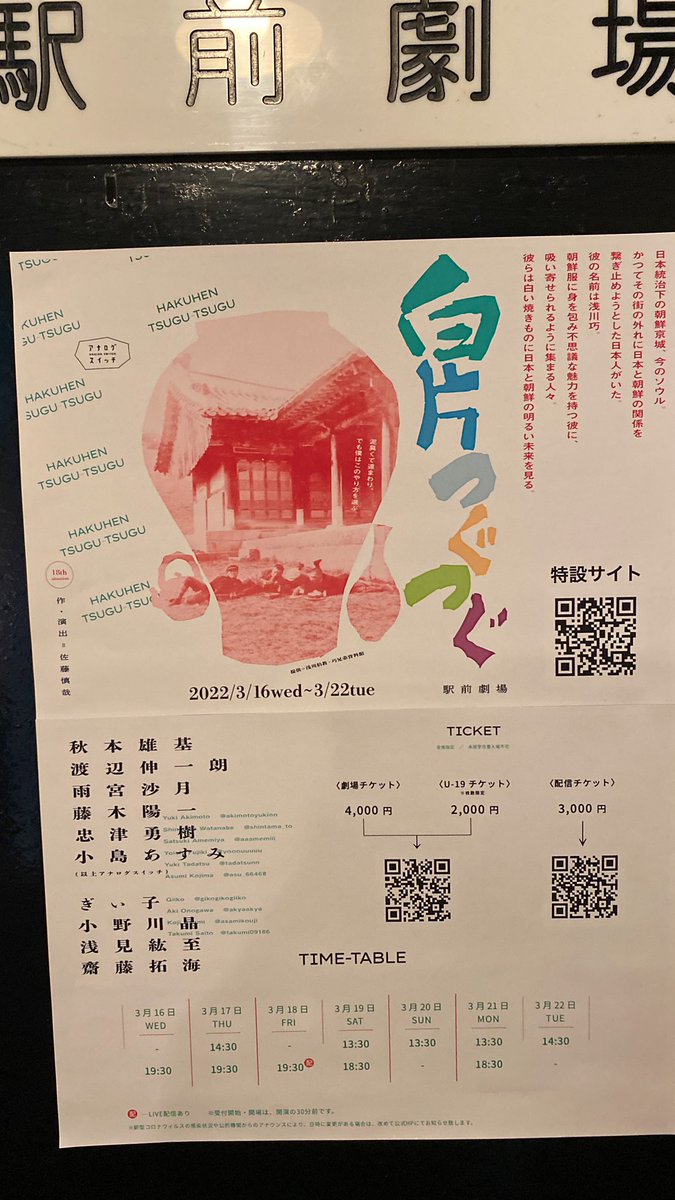ストーリーは事前紹介の通り。終演後に調べて知ったが、実在の人物、浅川巧の物語。日韓併合から、日中戦争に向かう時期、韓国にあって、植林や陶器の研究に従事した日本人。こちらも実在の「朝鮮民族美術館」の開館までの道のりと、朝鮮の人々との交流を描く作品。恥ずかしくも、こんな日本人がいたとは、この物語を観るまで知らなかった。