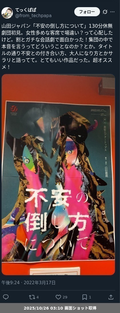 【ネタバレ分離】昨日観た芝居、 山田ジャパン「不安の倒し方について」の観劇レポートです。