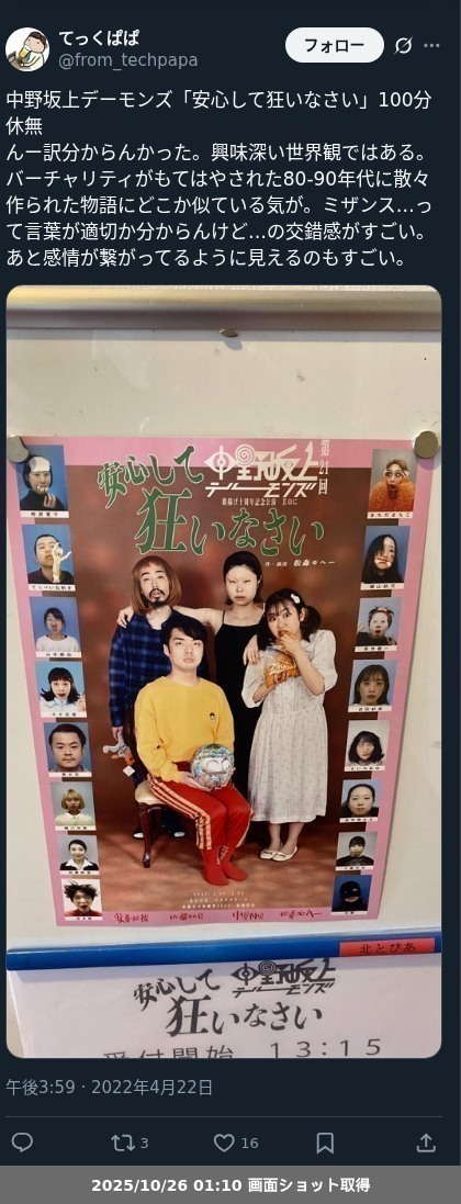 【ネタバレ分離】昨日観た芝居、 中野坂上デーモンズ「安心して狂いなさい」の観劇レポートです。