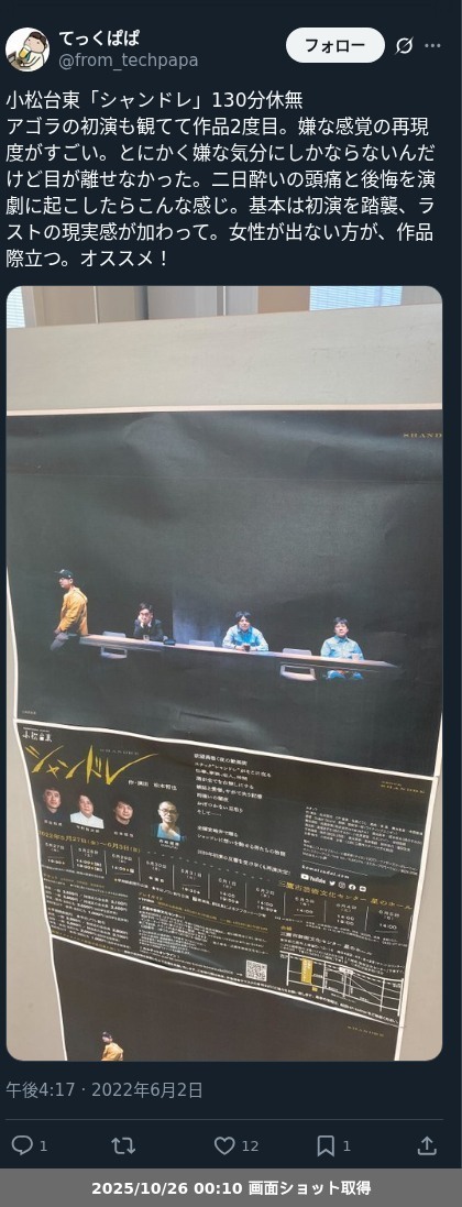 【ネタバレ分離】昨日観た芝居、 小松台東「シャンドレ(再演)」の観劇レポートです。