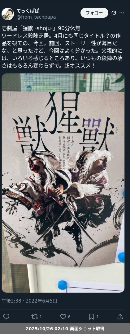 【ネタバレ分離】昨日観た芝居、 壱劇屋「猩獸 -shoju-」の観劇レポートです。