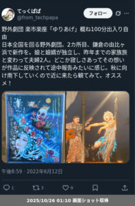 | 日時場所 | 2022/06/11(土)~2021/06/13(月) 鎌倉 海浜公園由比ケ浜地区 スポーツ広場【野外劇】(神奈川県) 他全国を巡業 |