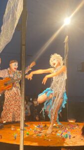 昨年の公演を最後に、娘の萌と、娘婿の佑之助が退団。2人は、佑之助の実家長野で農業を始めたという。それ故、今年からは夫婦二人だけでの旅公演。10年前に観た萌の舞台は、とても印象に残っていて、成長して結婚した萌と家族四人での舞台は、感慨深いものがあった。それだけに、2人での舞台。やはりどこか寂しさは否めない。でも、各地での公演を打つ際の支援者が多くなっているからか、円形の回転舞台に集う客席はほほ満席。歌と踊りと生演奏。そして投げ銭。いつもの楽しい舞台はそのままに。