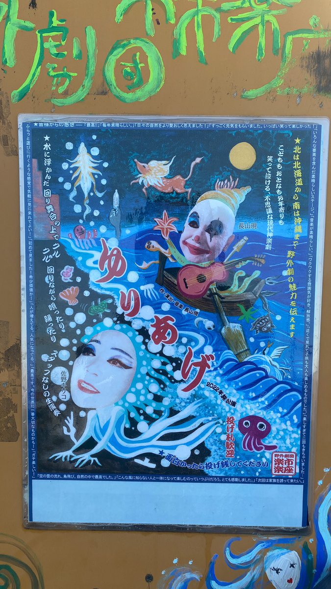 昨年の公演を最後に、娘の萌と、娘婿の佑之助が退団。2人は、佑之助の実家長野で農業を始めたという。それ故、今年からは夫婦二人だけでの旅公演。10年前に観た萌の舞台は、とても印象に残っていて、成長して結婚した萌と家族四人での舞台は、感慨深いものがあった。それだけに、2人での舞台。やはりどこか寂しさは否めない。でも、各地での公演を打つ際の支援者が多くなっているからか、円形の回転舞台に集う客席はほほ満席。歌と踊りと生演奏。そして投げ銭。いつもの楽しい舞台はそのままに。
