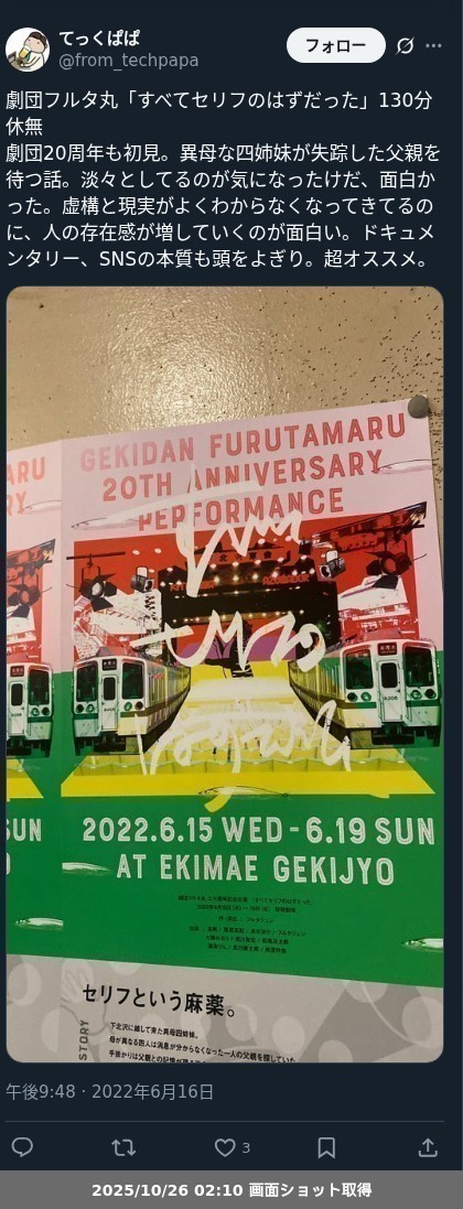 【ネタバレ分離】昨日観た芝居、 劇団フルタ丸「すべてセリフのはずだった」の観劇レポートです。