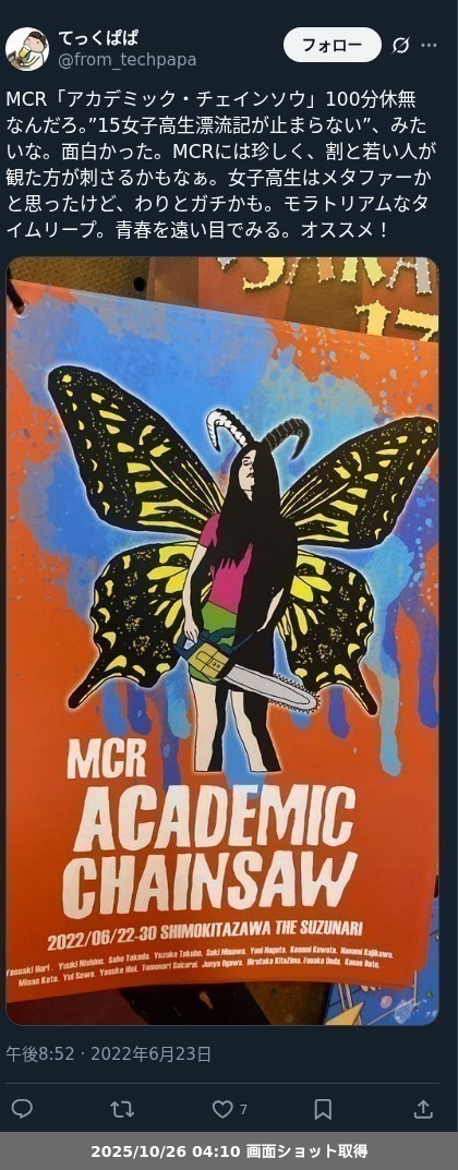 【ネタバレ分離】昨日観た芝居、 MCR「アカデミック・チェインソウ」の観劇レポートです。