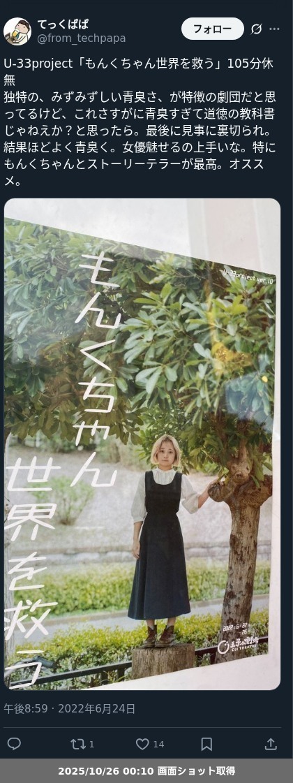 【ネタバレ分離】昨日観た芝居、 U-33project「もんくちゃん世界を救う」の観劇レポートです。