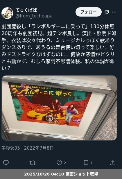 【ネタバレ分離】昨日観た芝居、 劇団鹿殺し「ランボルギーニに乗って」の観劇レポートです。