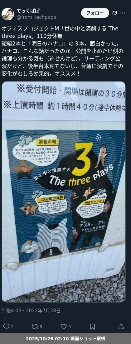 【ネタバレ分離】昨日観た芝居、 オフィスプロジェクトM「世の中と演劇する The three plays」の観劇レポートです。