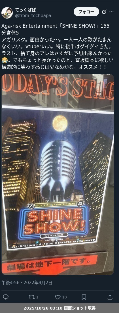 【ネタバレ分離】昨日観た芝居、 Aga-risk Entertainment「SHINE SHOW!」の観劇レポートです。