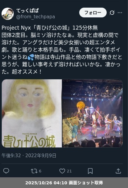 | 観劇日時 | 2022年9月9日 19時00分〜 |