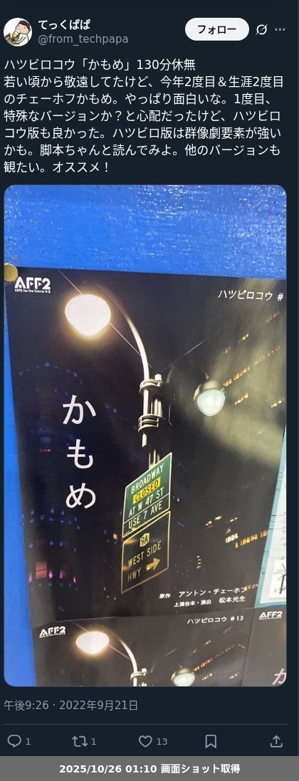 若い頃から敬遠してたけど、今年2度目&生涯2度目のチェーホフかもめ。やっぱり面白いな。1度目、特殊なバージョンか?と心配だったけど、ハツビロコウ版も良かった。ハツビロ版は群像劇要素が強いかも。脚本ちゃんと読んでみよ。他のバージョンも観たい。オススメ!