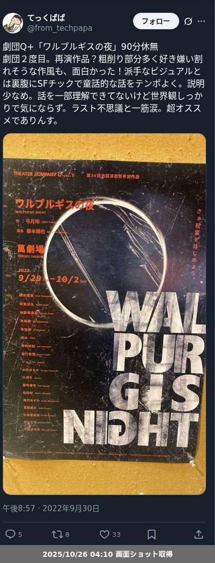 【ネタバレ分離】昨日観た芝居、 劇団Q+「ワルプルギスの夜」の観劇レポートです。
