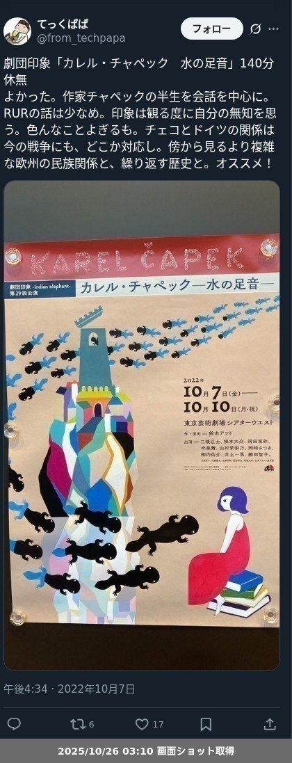 【ネタバレ分離】昨日観た芝居、 劇団印象-indian elephant-「カレル・チャペック〜水の足音〜」の観劇レポートです。