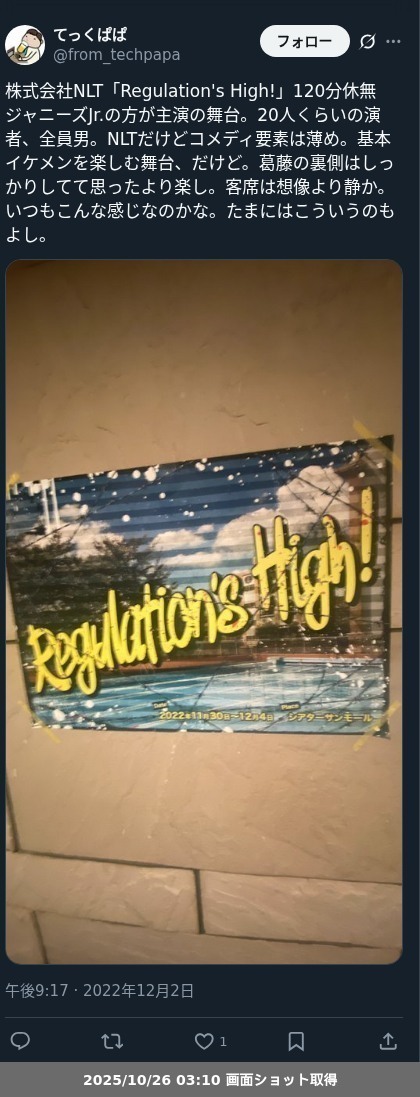 【ネタバレ分離】昨日観た芝居、 株式会社NLT「Regulation's High!」の観劇レポートです。