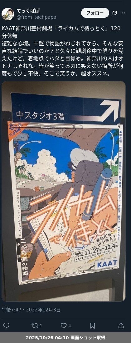 【ネタバレ分離】昨日観た芝居、 KAAT神奈川芸術劇場「ライカムで待っとく」の観劇レポートです。