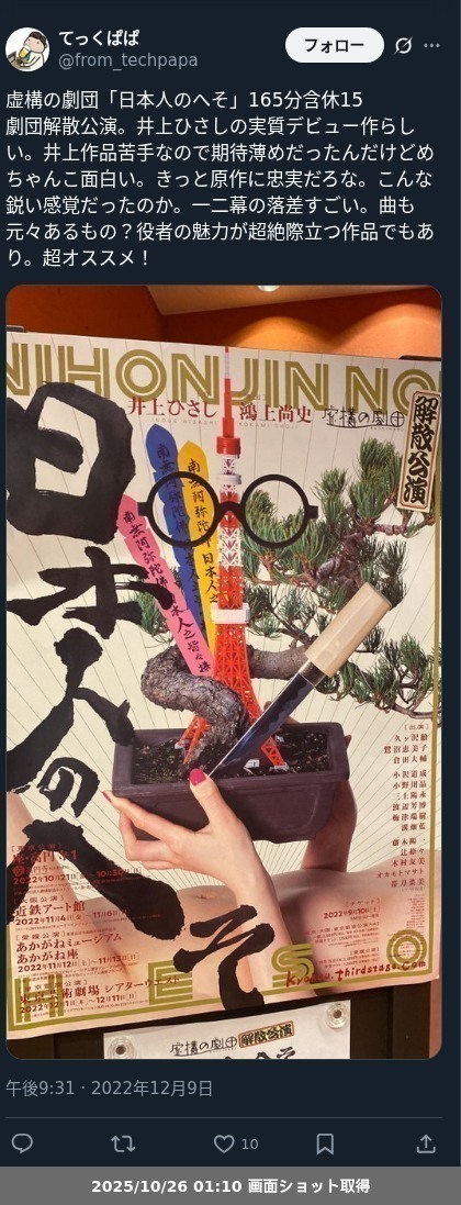 【ネタバレ分離】昨日観た芝居、 虚構の劇団「日本人のへそ」の観劇レポートです。
